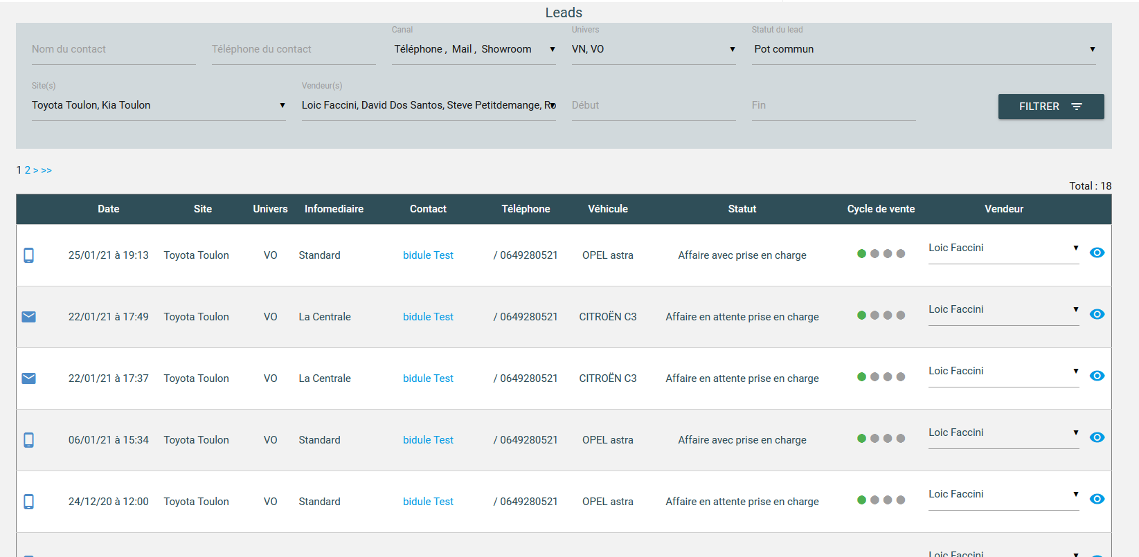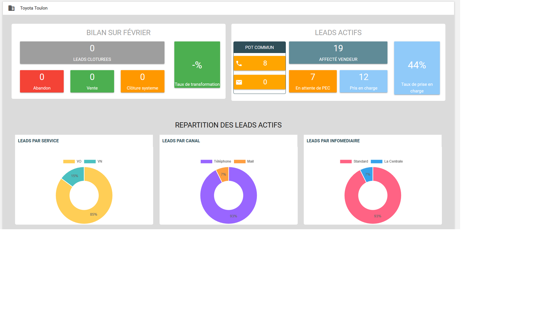 - Page pilotage :ajout des tableaux de répartition des leads du mois en cours par vendeur (leads actifs et cloturés) avec Tx de PEC et Tx transfo